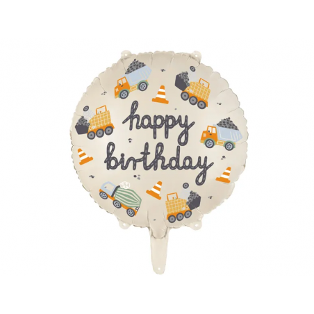 Balón je okrúhly s nápisom „happy birthday“ a potlačou stavebných vozidiel.